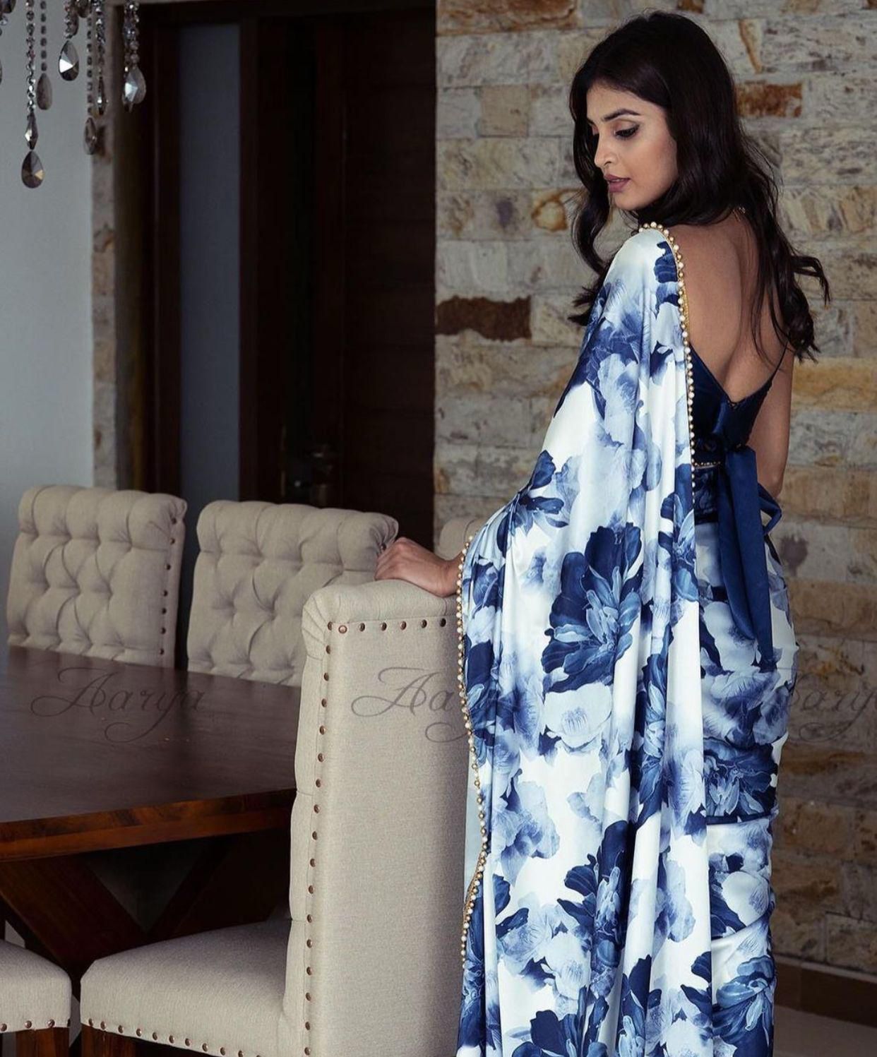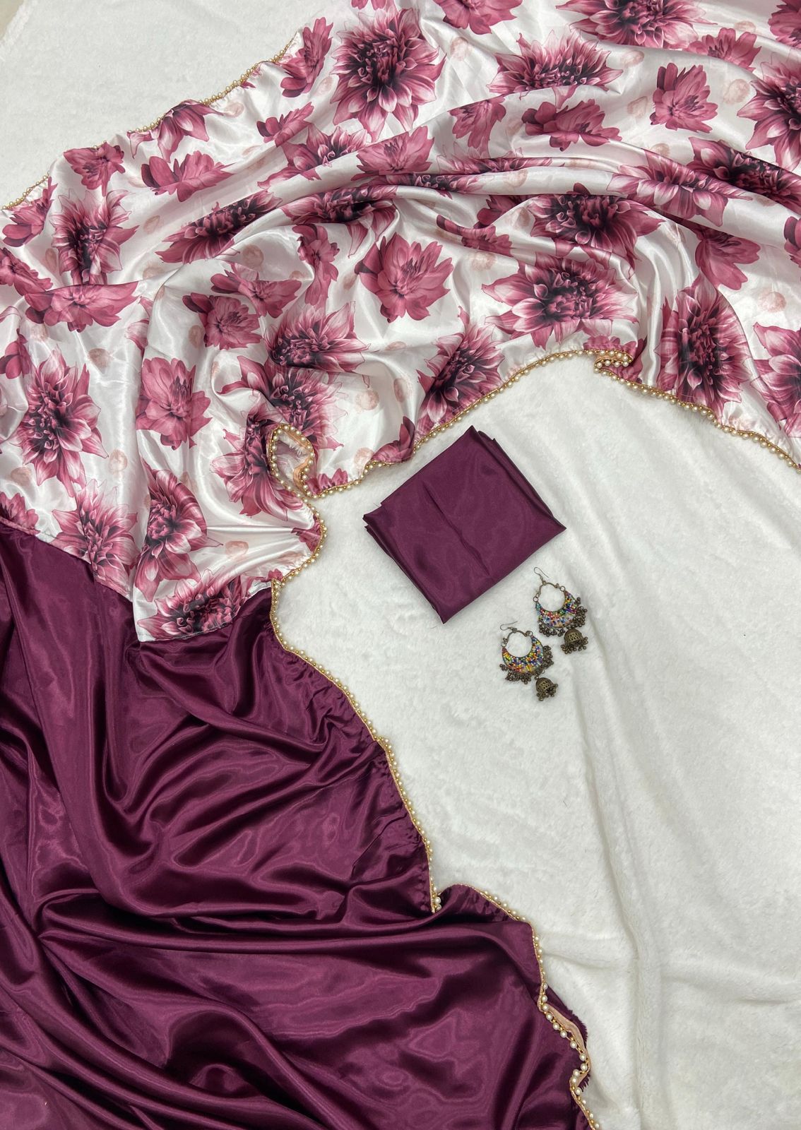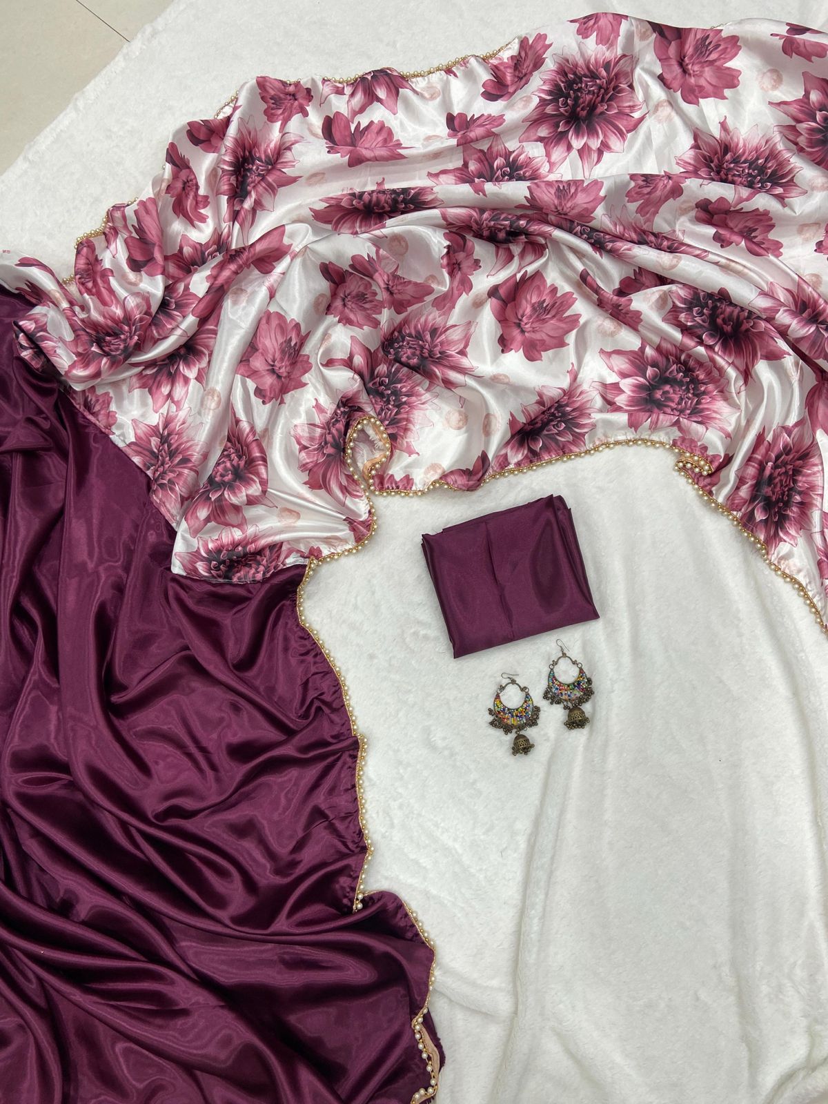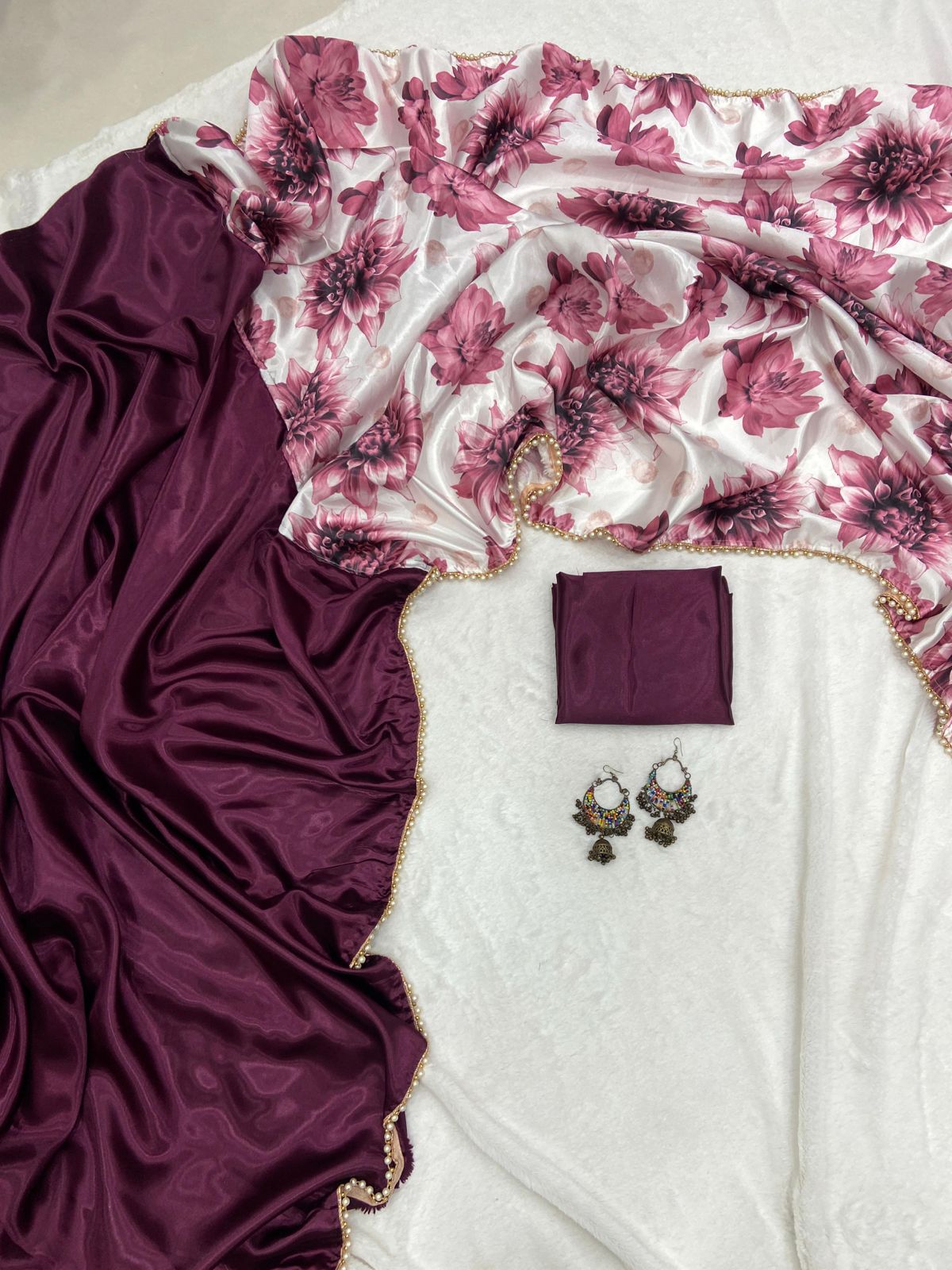 Stay beautiful with our new half half satin saree collection with beautiful flower printed pallu and pearl lace ....